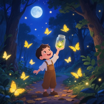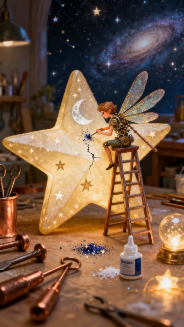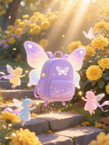 夜幕初降的儿童房窗台,蓝色星空主题书包放在小书桌上,书包上星星挂件微微发光,空中浮现一个戴着小帽子的星星精灵,轻轻托起书包带,窗外飘着点点萤光,温暖梦幻,突出陪伴与安心感