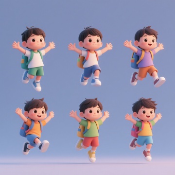 Q版可爱卡通风格儿童系列素材套系,4个不同场景,每个场景中都有一个Q版儿童坐在不同物品上。第一个场景:一个扎着双马尾的小女孩,穿着带有粉色花朵图案的白色连衣裙,蓝色袜子配红色小皮鞋,正开心地坐在黄色纸飞机上,右手举起食指指向天空,眼睛看向手指方向,表情天真可爱,整体呈现出圆润的3D立体效果,色彩明快柔和,边缘光滑无棱角,背景为纯白色。第二个场景:一个Q版儿童坐在一本打开的彩色书本上,书本有明显的书页层次感,儿童穿着与第一个场景风格统一的可爱服饰,表情愉悦,姿态自然。第三个场景:一个Q版儿童坐在弯弯的黄色月亮上,月亮表面有柔和的光泽感,儿童或躺或坐,姿态舒适惬意,服饰保持Q版可爱风格。第四个场景:一个Q版儿童坐在几级彩色的台阶上,台阶有立体感,儿童坐在台阶中间或最上层,表情活泼,整体风格与前三个场景统一,色彩搭配协调,所有场景均无LOGO、电话地址及二维码。