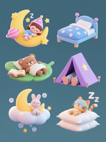 一套6个完全不同元素内容的睡眠主题3D卡通风格系列素材集合,规整排布于纯白色纯色背景上,整体保持圆润可爱的Q版C4D渲染风格,温暖明亮的色彩搭配,柔和均匀的光影效果,细腻光滑的材质表现,每个元素都有俏皮的小细节和精致的高光处理。元素1:一个戴着紫色星星睡帽的小女孩蜷缩在黄色弯月上熟睡,周围环绕着粉色星球和黄色星星;元素2:一只穿着条纹睡衣的卡通小熊抱着枕头躺在云朵形状的床上,床头有小夜灯和故事书;元素3:一个蓝色的睡眠图标,由闭着的眼睛和弯曲的睡眠曲线组成,周围点缀着小星星和Z符号;元素4:一张铺着柔软粉色床单的双人床,床上有两个枕头和一个毛绒玩具,床头柜上有一杯温牛奶和一个闹钟;元素5:一个漂浮的睡眠舱,里面有一个宇航员穿着睡衣在零重力环境下安睡,舱外有星星和行星;元素6:一对穿着睡衣的卡通情侣背靠背躺在床上,男士打着小呼噜冒出Z字,女士抱着一个月亮形状的抱枕。所有元素大小统一,排布整齐,形成和谐统一的系列感。