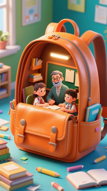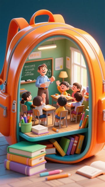 夜幕初降的儿童房窗台,蓝色星空主题书包放在小书桌上,书包上星星挂件微微发光,空中浮现一个戴着小帽子的星星精灵,轻轻托起书包带,窗外飘着点点萤光,温暖梦幻,突出陪伴与安心感,3:4竖图,柔光风格