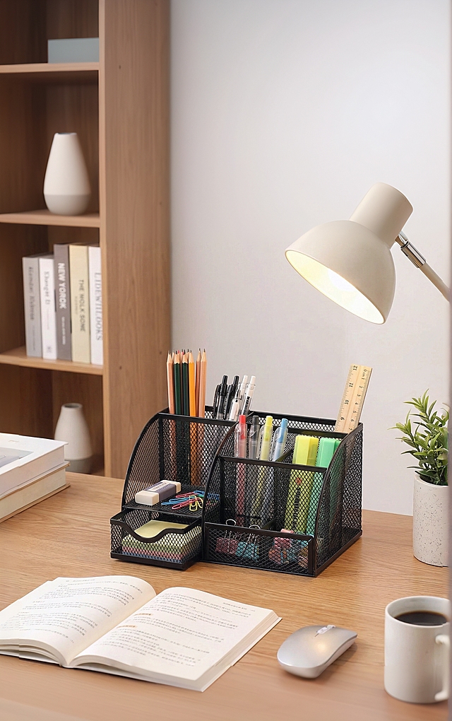 真实办公场景,简约整洁的明亮办公桌面职场办公区背景,规整摆放爆款笔插在收纳盒、笔记本放在桌面、收纳架摆放文件,收纳用品处于实用状态特写,光线明亮自然,画面无杂乱元素,突出产品办公适配性与高效实用属性,场景化风格塑造品质信任感详情