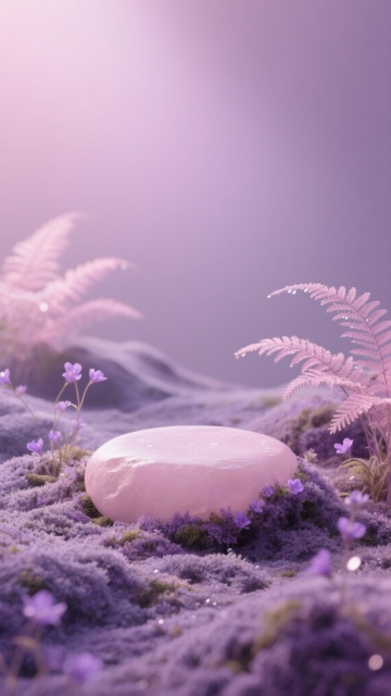 超写实摄影风格,俯视角微距镜头下的晨雾弥漫古老森林地表,画面以清新柔和的浅绿色渐变背景为主,营造宁静自然的氛围。前景是覆盖着绒毯般鲜绿苔藓的地面,苔藓呈现出细腻的纹理和饱满的质感,其间点缀着半透明的蕨类嫩芽和三朵顶戴珍珠晨露的白色小蘑菇,中央位置一块布满深绿苔藓的不规则灰黑色岩石被细密的银灰色菌丝网络温柔托举,岩石表面镶嵌着几粒折射彩虹光晕的露珠,边缘略显粗糙,整体形态自然质朴。构图采用近景特写,主体明确,景深控制得当,背景是逐渐虚化的深绿蕨类植物墙,空气中悬浮着肉眼可见的微小水汽颗粒,光线柔和均匀,从上方树冠缝隙中投下柔和晨光,在苔藓和岩石表面形成斑驳的金色光斑与微妙的光影变化,高光处露珠闪闪发光,阴影部分自然柔和,整体色调是多层次翡翠绿与苔藓灰的和谐交融,传达出清新、静谧、充满生机的自然之美。