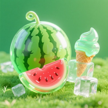 夏日大西瓜,一个西瓜,分别有没切的和切开的,玻璃透感,旁边有冰淇淋、冰块等小元素点缀,草绿色背景。