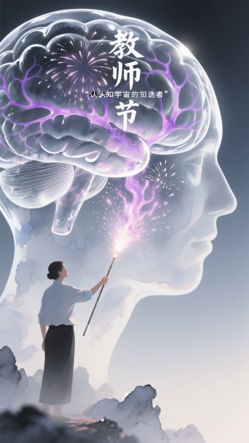 这张海报的灵感围绕教师节展开,旨在歌颂教师的奉献与引导作用。 画面中,教师手持象征光明与知识的光源,如同在黑暗中为学生照亮求知之路,体现出教师是知识的传播者,为学生驱散无知的阴霾。翻开的书本代表着知识的宝库,是教师传授知识的载体。背景里学生们沿着道路前行,寓意着在教师的指引下,学生们朝着理想与未来奋进,凸显出教师在学生成长过程中如同引路人一般的关键角色,整体传达出对教师辛勤付出与育人精神的赞美