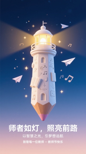 梦幻插画风,轻拟物铅笔灯塔,照亮知识航程,教师节温馨祝福。