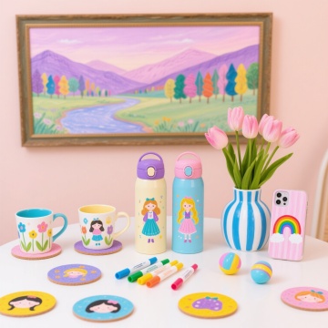 把这个形象放到鸭舌帽上,水杯上,钥匙扣,笔记本上和杯垫上,这些物料都放在明亮室内的桌子上