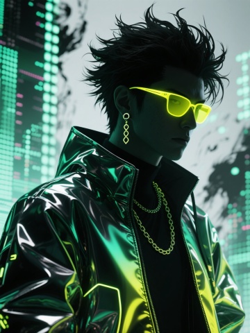 数据流编织成的连帽斗篷,实时滚动着发光代码,搭配霓虹网格紧身衣,黑客空间站场景,数字艺术