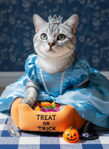 拟人风3D角色猫身着蓝裙戴皇冠,毛发生长细腻,面料质感逼真,梦幻甜蜜氛围中融合万圣节元素,可爱感十足。