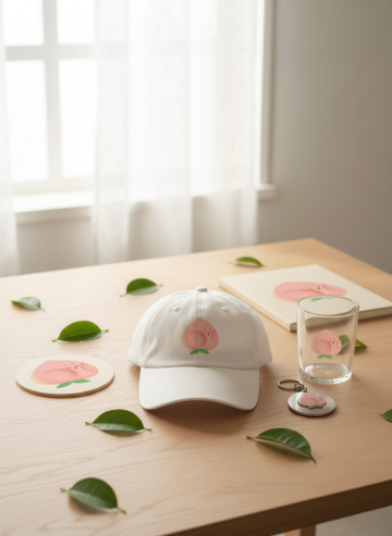 把这个形象放到鸭舌帽上,水杯上,钥匙扣,笔记本上和杯垫上,这些物料都放在明亮室内的桌子上