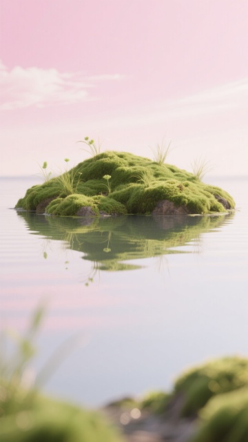 蓝天白云,前景是一个超现实植物岛。岛屿上是一些小石头和一块巨大的树桩(上面长着几朵小小的紫色的花朵),周围花朵呈亮紫色散落在岛屿周围。岛屿周围的海水呈深蓝色(波光粼粼),倒映着天空。景色宁静而广阔,辉光加持。文案大号艺术字偏上“联想小新AI做自己”
