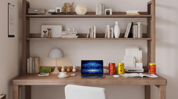 现代简约风格,科技感十足的办公桌,手账风笔记本与耳机点缀,营造舒适学习氛围。