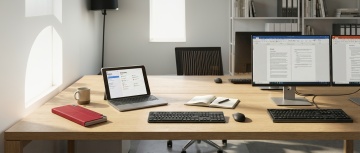 极简主义风格的桌面俯视图,柔和自然光从左上方斜射,营造出明亮干净的氛围,桌面上摆放着不同配色的简约办公用品,包括白色键盘、灰色笔记本、金属色钢笔和一杯冒着热气的咖啡,场景可替换为木质书桌或大理石台面,增加绿植盆栽、简约台灯等不同摆设,整体色调保持清新淡雅,构图采用三分法留白设计,突出物品的质感和空间层次感,适合作为桌面背景使用。