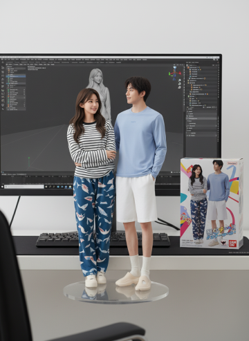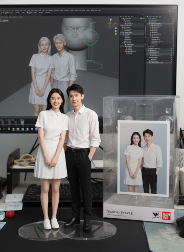 生成图1图2的合照。然后将这个合照制作成一个商业化1/7比例手办,风格写实,环境逼真。手办放置在电脑桌上,配有一个圆形透明亚克力底座,底座上没有文字。电脑屏幕上显示着手办的Zbrush建模过程。电脑屏幕旁边是一个万代风格的玩具盒,上面印有原始画作。