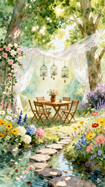 晨雾弥漫的森林小径,光影斑驳,水彩风与印象画派交融,清新梦幻,静谧唯美的自然诗篇。