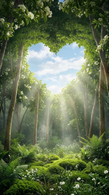 清晨薄雾笼罩的森林小径,参天大树林立,阳光透过枝叶形成金色光柱洒在铺满落叶的小路上,两侧长满茂密的绿色蕨类植物和白色、蓝色野花,空气湿润清新,整体呈现明亮通透的日系动画风格,色彩以翠绿、金黄和淡蓝为主,光影柔和梦幻,营造出宁静神秘的氛围。