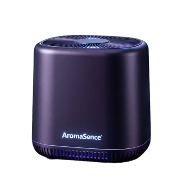 现代简约风加湿器,3D渲染质感,玻璃桌面倒影清晰,蓝紫渐变光影营造未来科技感与清透柔和氛围,轻拟物设计突显舒适生活美学。