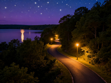 夜晚背景,深邃的深蓝色夜空布满璀璨繁星,银河清晰可见,点缀着暗紫色的云朵,地面上点缀着几簇温暖的篝火,火光映照下的草地和石板小径,营造出宁静而神秘的氛围。