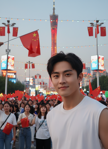 国潮风与霓虹灯交织,实景拍摄展现喜庆氛围,广州塔背景烘托节日盛景,人物神态自然,传递全民欢庆国庆的视觉张力。