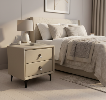 极简风格卧室室内设计,以浅米色墙面为背景,搭配原木色实木床架,铺着浅灰色亚麻质感床单,床头摆放两个浅米色方形靠枕和两个浅灰色长条形枕,床尾随意搭着一条米白色针织毯。床的左侧是原木色床头柜,上面放置一个白色陶瓷小花瓶,插着几根干枝,旁边有一个白色小茶杯和托盘。床头柜上方墙面挂着一幅极简风格装饰画,画框为原木色,画面是三束黑色线条勾勒的麦穗图案。床的右侧是一盏白色金属落地灯,灯罩为米白色布艺材质。床前浅色木地板上铺设一块米白色长方形棉麻地毯,地毯上放着一个圆形编织篮,篮子里有一本翻开的书。整体色调以米色、浅灰、原木色为主,光线柔和,营造出宁静、舒适、简洁的氛围,空间布局对称平衡,线条干净利落,无多余装饰,体现极致的简约美学。