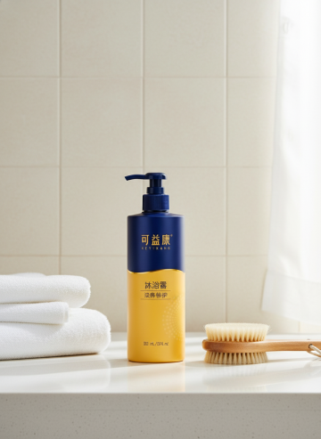 双色设计风瓶身搭配轻拟物质感,蓝金配色营造清新清爽感,简约主义布局强化舒适氛围,实景感浴室场景传递柔和治愈体验。