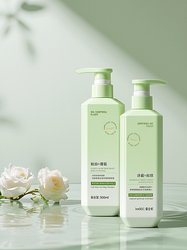 极简现代风洗发露,液态质感瓶身搭配柔和光影,清新绿植点缀浴室场景,传递清爽舒适与性冷淡美学。详情