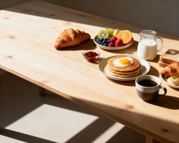 温暖晨光中的厨房场景,轻拟物风搭配简约主义设计,柔和色调与面料质感营造温馨舒适氛围,实景感十足,传递居家生活的宁静与惬意。