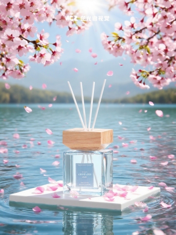 中式意境与3D重拟物结合,水墨晕染的水面倒影,玻璃质感香水瓶映衬粉樱,唯美感与梦幻感交织,尽显优雅东方美学。