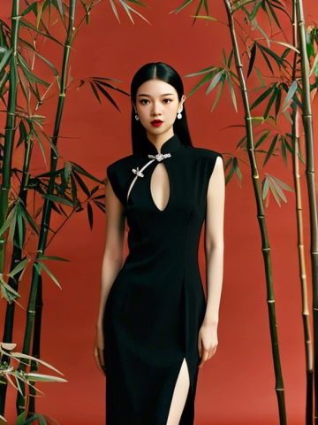 国潮风旗袍,融合中式感与时尚剪裁,黑色面料凸显优雅复古,竹影红墙衬托东方韵味。