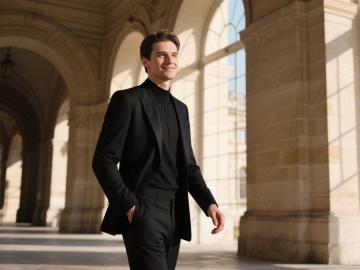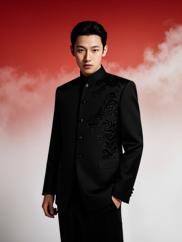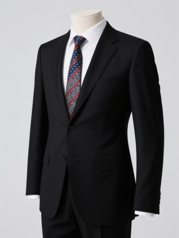 6. 纯黑色西装搭配白色衬衫,藏青色底红色与白色交叉斜纹花纹领带,纯色背景,专业商务风格,清晰的服装剪裁细节,平滑的面料质感,正面展示,无头模特