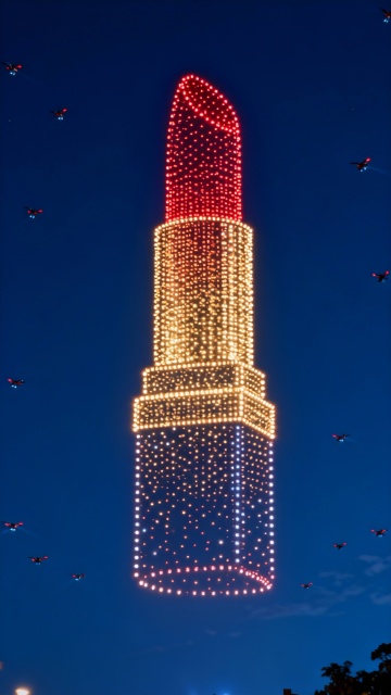 赛博朋克风巨型口红由无人机灯光矩阵构成,霓虹灯效与粒子光影交织,未来感十足,梦幻酷炫,展现虚拟现实中的重拟物美学。