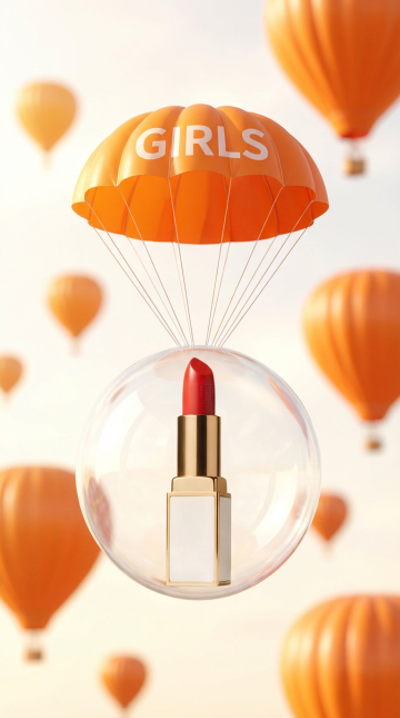 梦幻3D风格,玻璃质感透明球包裹奢华口红,橙色降落伞印有“GIRLS”,背景热气球漂浮,清透时尚,节日氛围感十足。