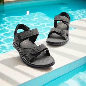 简约现代凉鞋,池畔实景展现清爽时尚感。