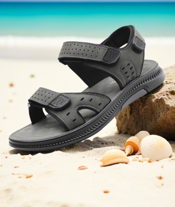 简约现代凉鞋,皮影风设计,清爽舒适,海滩实景感。
