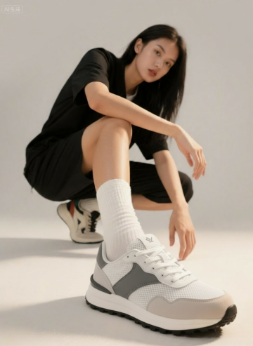 一组六双相同造型的复古运动鞋产品展示图,保持原图中白色鞋面搭配深蓝色细节、多材质拼接的设计特征,采用纯白色纯色背景,六双鞋呈2x3网格状规整排布,每双鞋分别具有完全不同的材质质感:1.光滑亮面皮革搭配反光蓝漆,2.磨砂哑光皮革搭配植绒蓝纹,3.透明水晶质感鞋面搭配金属蓝装饰,4.粗针织毛线鞋面搭配绒布蓝边,5.碳纤维纹理鞋面搭配液态金属蓝细节,6.木纹肌理鞋面搭配牛仔布蓝拼接,所有鞋子保持相同的多角度摆放姿态,光线为柔和顶光,阴影清晰统一,整体呈现简洁专业的产品目录式视觉效果。