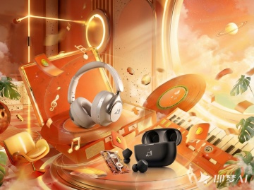 撕纸风与金属质感结合,耳机从纸面破出,科技感与未来感交织,杂志风布局彰显潮流与时尚,极繁主义细节强化视觉冲击。