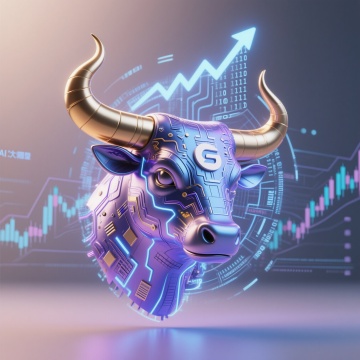 赛博朋克风3D机械牛头,金属质感融合霓虹电路,未来科技感十足,背景数据流与上升箭头象征AI金融趋势,酷炫视觉冲击力强。