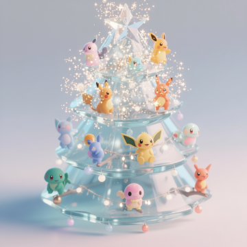 可爱的宝可梦主题的透明圣诞树特写镜头,每层是各式各样的宝可梦精灵