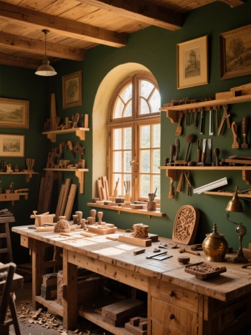 木质结构的3D几何空间,光影交错,简约温馨,静谧质朴,木雕风设计。