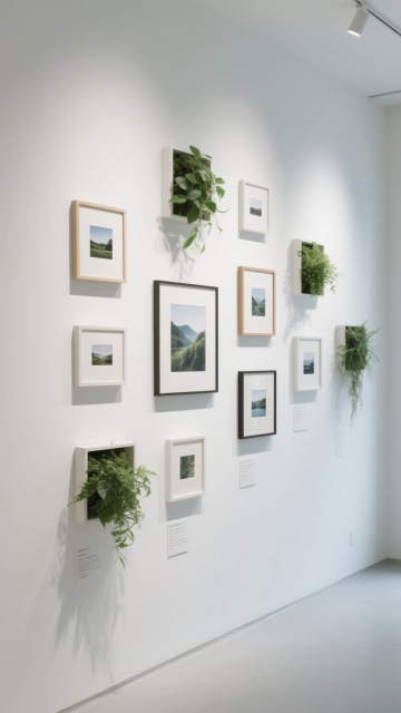 极简主义风格的白色墙面展示设计,墙上错落有致地悬挂着多个不同尺寸的相框和绿植装饰,相框内包含风景摄影图片和少量文字说明,整体呈现出简约、现代、有序的视觉效果,光线柔和明亮,空间感通透,绿植与相框形成自然与人文元素的和谐搭配,营造出清新、舒适且富有设计感的室内氛围。