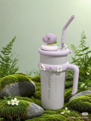 不改变杯子,将杯子置于铺满苔藓地面的石头上,点缀绿植、白色花朵,背景浅绿斑驳光影