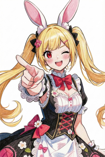 二次元动漫风格人像,金发双马尾少女,粉色猫耳,红色蝴蝶结发饰,身着白色上衣搭配粉色外套、蓝色领带及黑色短裙,右手伸出指向观者,左眼 wink,表情欢快活泼,背景为粉紫色渐变,点缀像素风格心形、星星及几何图案,整体色彩明快鲜亮,线条流畅,具有强烈的卡通动漫质感和青春活力氛围。