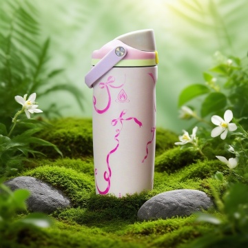 清新梦幻的3D风格水杯,融合轻拟物与水彩质感,置于虚拟自然中,粉色丝带图案点缀,营造唯美治愈氛围。