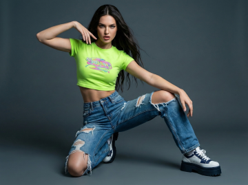 一个高级感欧美模特单膝跪姿,穿着图片上的穿搭,张扬时尚的姿势,纯色背景,(不同于图片片上模特的长相和姿势)