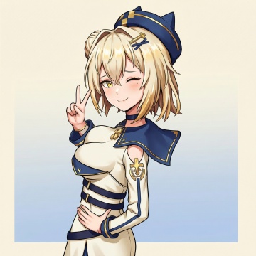 二次元动漫风格人像,金发双马尾少女,粉色猫耳,红色蝴蝶结发饰,身着白色上衣搭配粉色外套、蓝色领带及黑色短裙,右手伸出指向观者,左眼 wink,表情欢快活泼,背景为粉紫色渐变,点缀像素风格心形、星星及几何图案,整体色彩明快鲜亮,线条流畅,具有强烈的卡通动漫质感和青春活力氛围。
