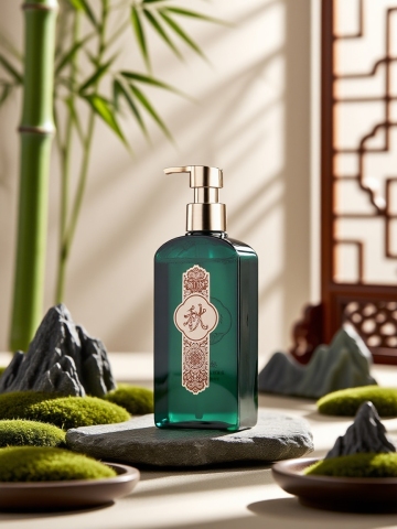 洗发水海报设计,两瓶深绿色透明液体洗发水瓶,搭配黑色按压泵头和白色标签,标签上有黑色文字与金色装饰细节,瓶身优雅放置于浅棕色木质树枝上。树枝下方是清澈湿润的水面,点缀着光滑石头,周围环绕着鲜活的绿色植物枝叶与根茎。整体采用清新自然的绿色调,柔和的侧光照明营造出宁静、有机、纯净的氛围,背景为渐变浅绿色。画面视觉层次清晰,以产品为绝对主体,光影效果细腻,水面呈现清晰的瓶身倒影,整体质感写实,设计简约自然,传达出天然植物萃取的产品特性。
