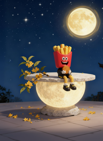 3D卡通风格,薯条拟人角色坐在月亮上,手持月饼,梦幻超现实主义夜景。