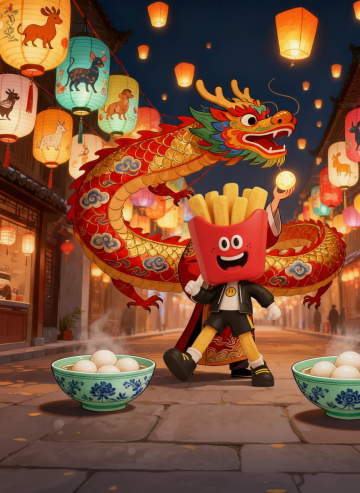 国潮风卡通形象,拟人化炸薯条与龙舞结合,喜庆灯笼点缀,水墨背景烘托节日氛围。