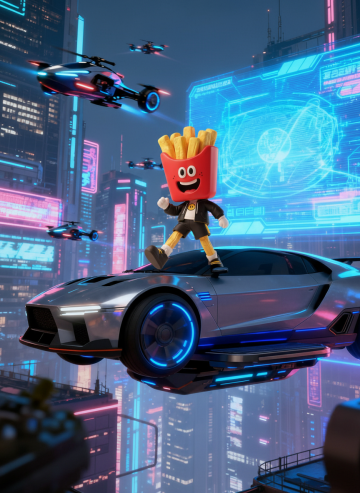 赛博朋克风未来城市,拟人薯条角色酷炫登场,霓虹灯效与飞车共舞,科技感十足。