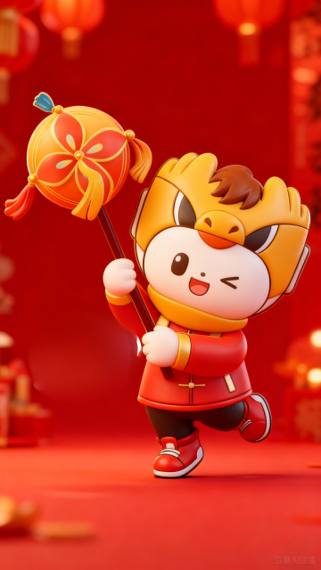 软3D风拟人小马,身着国潮红金唐装,手持灯笼立于祥云,夜市烟花映衬,喜庆卡通感十足,2026马年大吉。