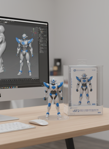 将这个图片制作成一个商业化1/7比例手办,风格写实,环境逼真。手办放置在电脑桌上,配有一个圆形透明亚克力底座,底座上没有文字。电脑屏幕上显示着手办的Zbrush建模过程。电脑屏幕旁边是一个万代风格的透明玩具盒,上面印有原始画作。